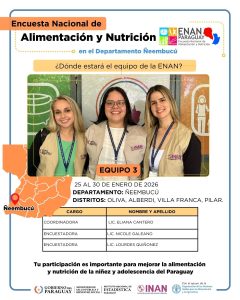La Encuesta Nacional de Alimentación y Nutrición (ENAN) dará continuidad este domingo 25 de enero en el Departamento Concepción, abarcando las ciudades de Itacúa y Paso Barreto, el equipo de trabajo estará en el Departamento en la semana del domingo 25 al viernes 30 de enero del 2026. Este esfuerzo permitirá, tras aproximadamente seis décadas, …