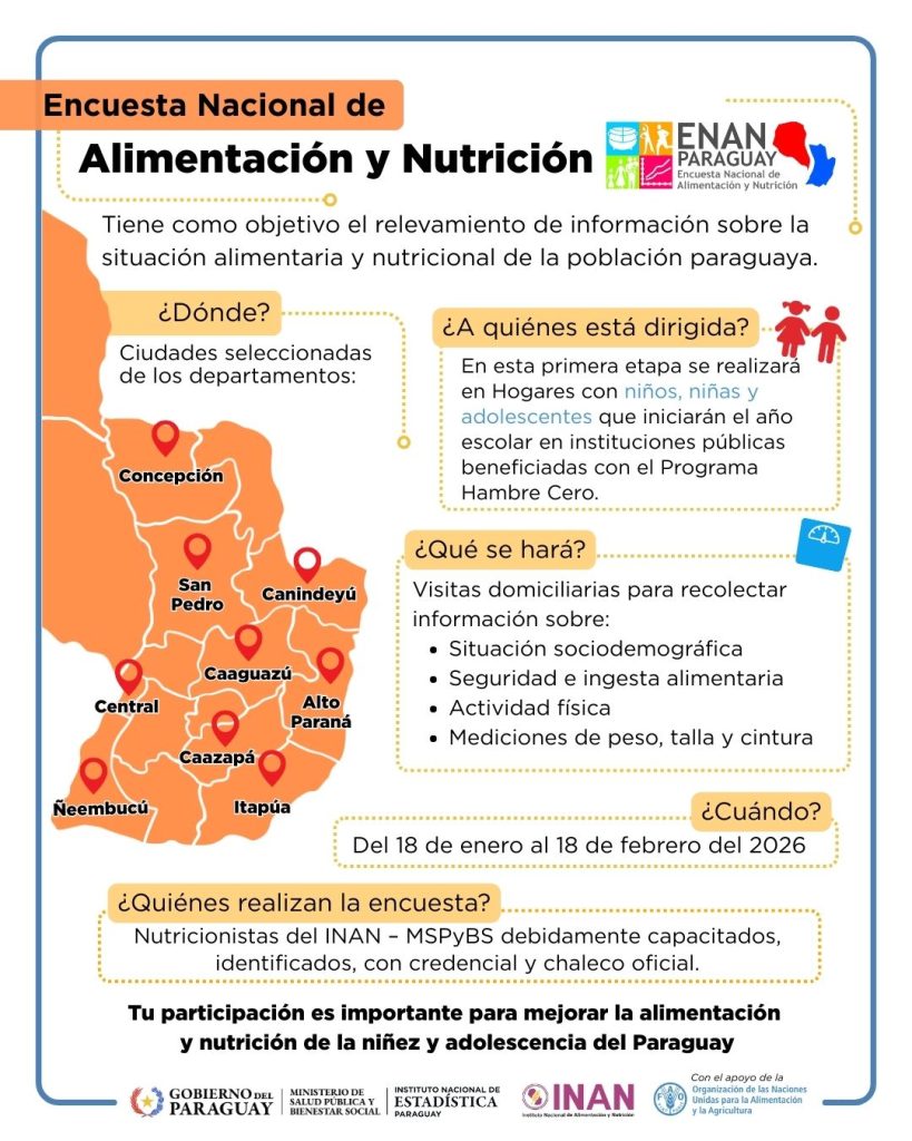 El Ministerio de Salud Pública y Bienestar Social, a través del Instituto Nacional de Alimentación y Nutrición (INAN), con el apoyo del Instituto Nacional de Estadística (INE) y la Organización de las Naciones Unidas para la Alimentación y la Agricultura (FAO), puso en marcha la primera etapa de la Encuesta Nacional de Alimentación y Nutrición (ENAN), una herramienta clave para conocer la situación alimentaria y nutricional de la población paraguaya.